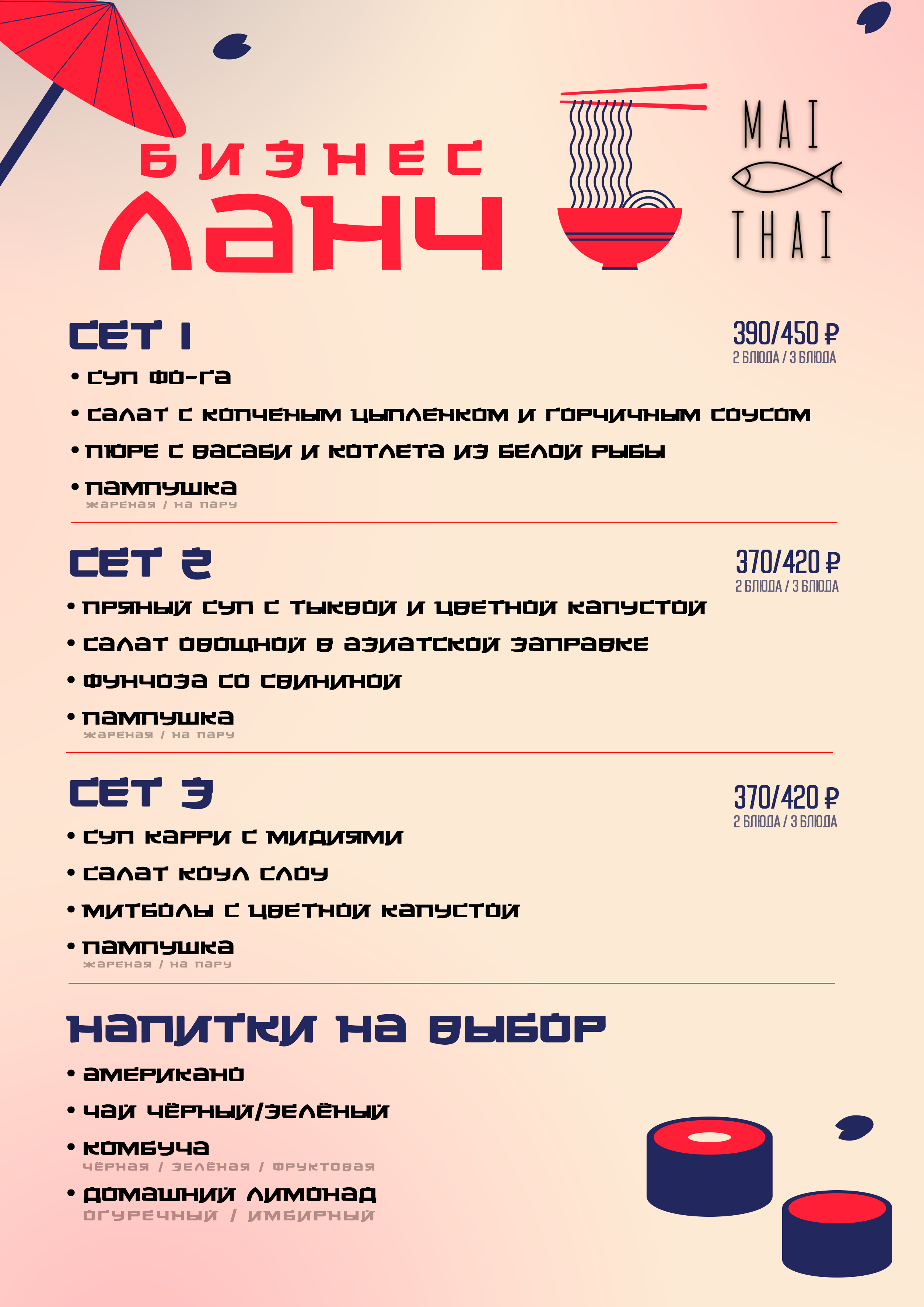 Состав: рис, уксус рисовый, сахар, соль, водоросли комбу, водоросли нори, огурец, угорь, майонез, соус шрирача, икра тобико, чеснок, соус кимчи, соус шичими, паста том ям, соус соевый, соус терияки, соус унаги, омлет, бульон хондаши, лук зеленый, кунжут, болгарский перец, кинза.Закуски